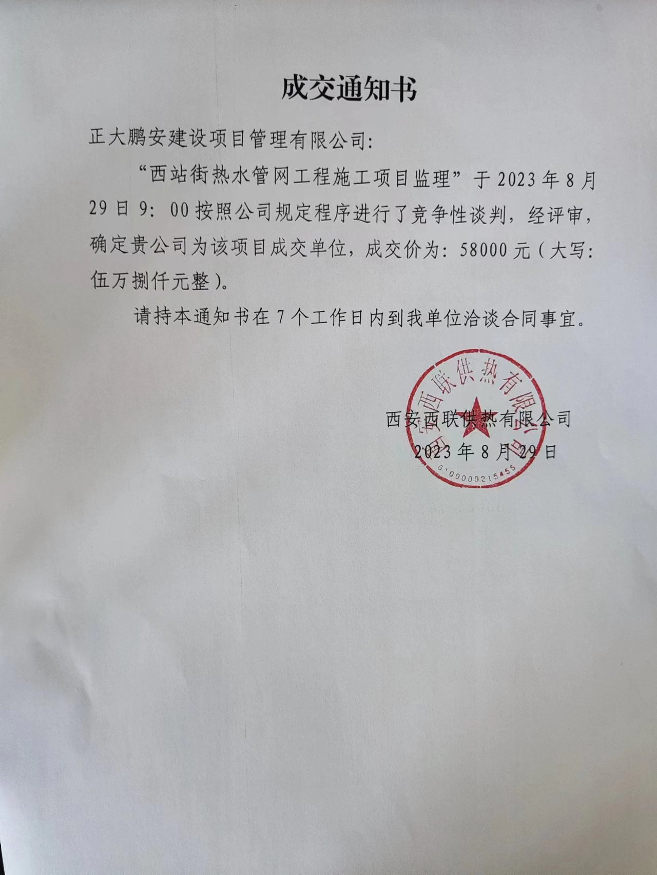 2023年8月,經(jīng)評(píng)標(biāo)委員會(huì)評(píng)定,招標(biāo)人確認(rèn),正大鵬安建設(shè)項(xiàng)目管理有限公司中標(biāo)西安西聯(lián)供熱有限公司的“西站街熱水管網(wǎng)工程施工項(xiàng)目監(jiān)理”項(xiàng)目。