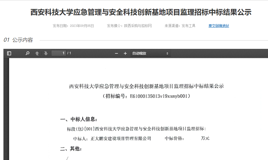 2023年9月,經(jīng)評標(biāo)委員會(huì)評定,招標(biāo)人確認(rèn),正大鵬安建設(shè)項(xiàng)目管理有限公司中標(biāo)西安科技大學(xué)的“西安科技大學(xué)應(yīng)急管理與安全科技創(chuàng)新基地項(xiàng)目監(jiān)理”。