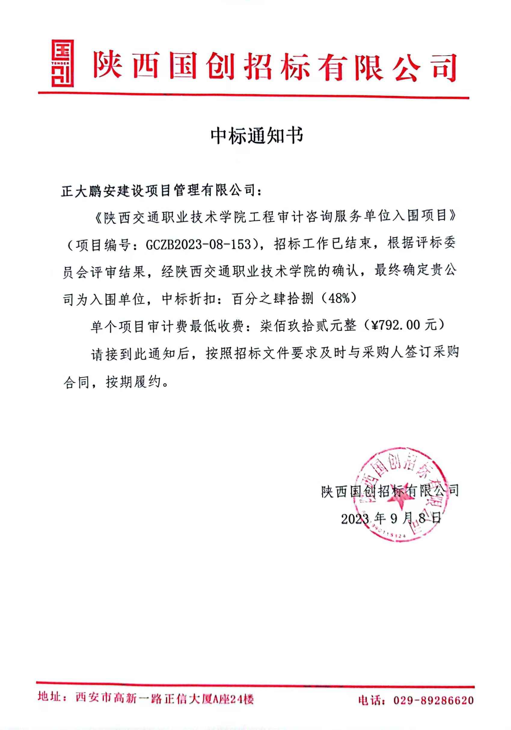 2023年9月,經(jīng)評標委員會評定,招標人確認,正大鵬安建設(shè)項目管理有限公司中標“陜西交通職業(yè)技術(shù)學院工程審計咨詢服務單位入圍項目 ”項目。