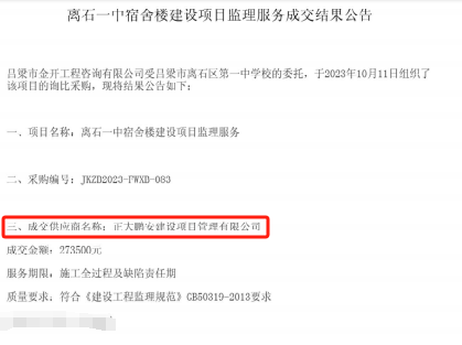 2023年10月,經(jīng)評標(biāo)委員會評定,招標(biāo)人確認(rèn),正大鵬安建設(shè)項目管理有限公司中標(biāo)呂梁市離石區(qū)第一中學(xué)校的“離石一中宿舍樓建設(shè)項目監(jiān)理服務(wù)”項目。