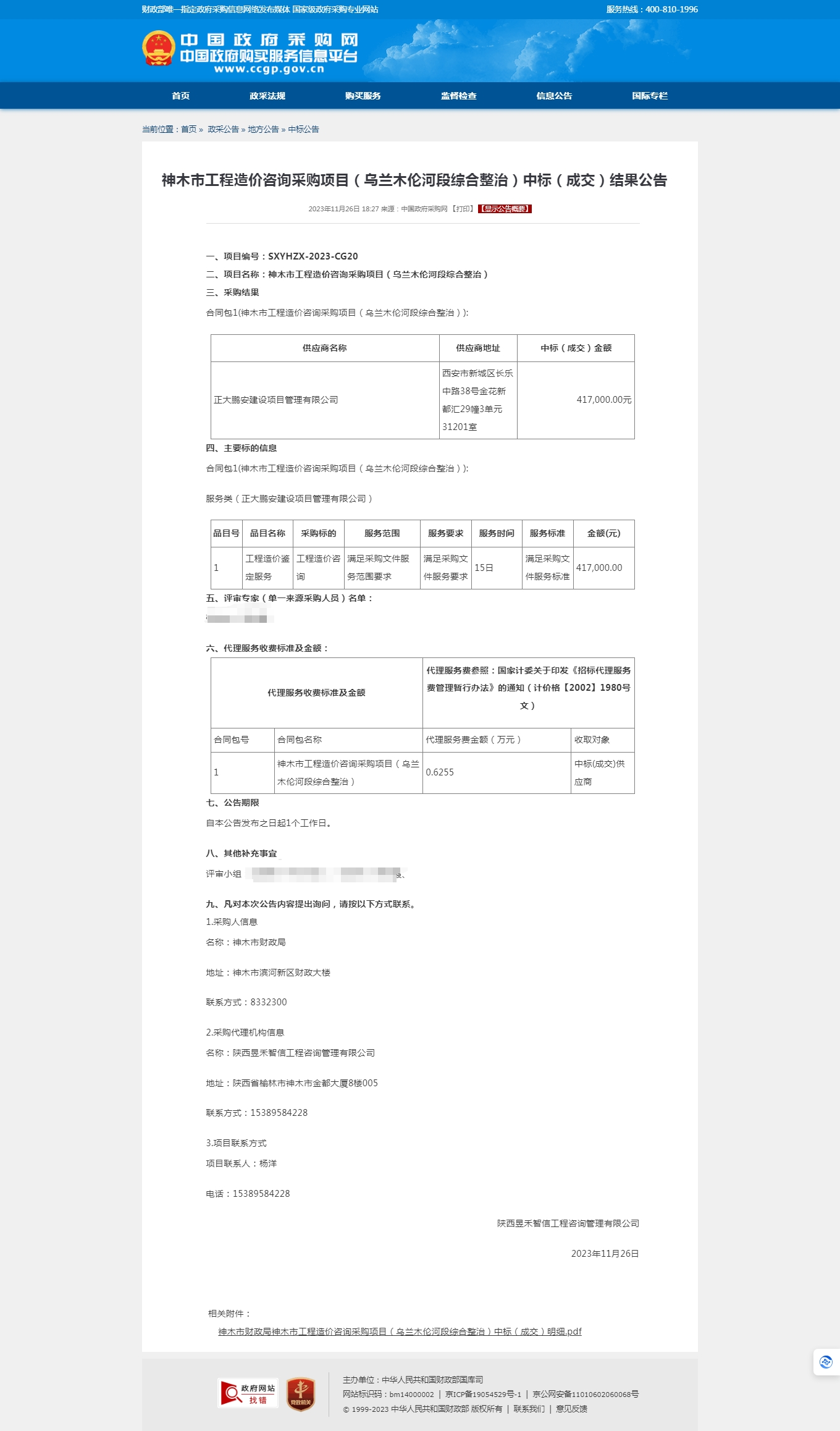 2023年11月,經(jīng)評標(biāo)委員會評定,招標(biāo)人確認(rèn),正大鵬安建設(shè)項(xiàng)目管理有限公司中標(biāo)“神木市工程造價咨詢采購項(xiàng)目(烏蘭木倫河段綜合整治)”。