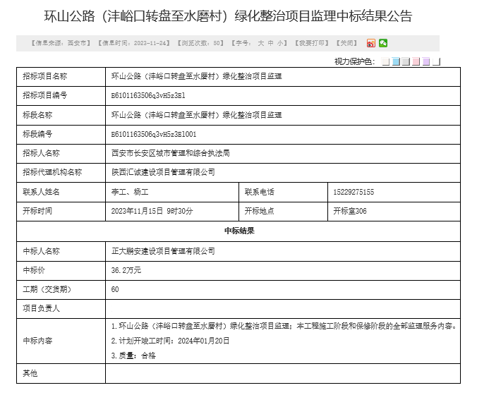 2023年11月,經(jīng)評標委員會評定,招標人確認,正大鵬安建設(shè)項目管理有限公司中標西安市長安區(qū)城市管理和綜合執(zhí)法局的“環(huán)山公路(灃峪口轉(zhuǎn)盤至水磨村)綠化整治項目監(jiān)理”項目。
