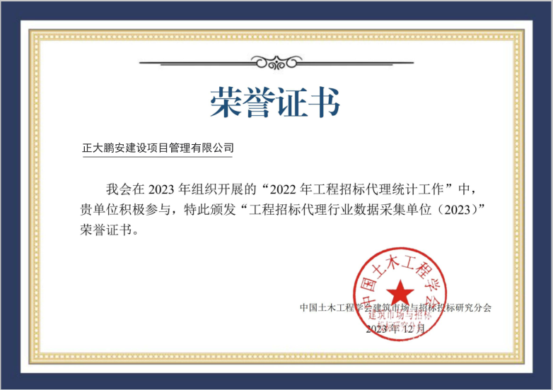 熱烈祝賀正大鵬安公司榮獲“工程招標代理行業(yè)數據采集單位(2023)”榮譽證書