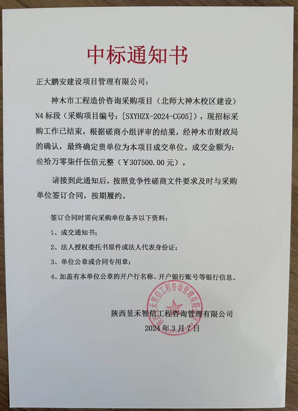 2024年3月,經(jīng)評(píng)標(biāo)委員會(huì)綜合評(píng)審,招標(biāo)人確認(rèn),正大鵬安建設(shè)項(xiàng)目管理有限公司中標(biāo)“神木市工程造價(jià)咨詢采購項(xiàng)目(北師大神木校區(qū)建設(shè))N4標(biāo)段”。