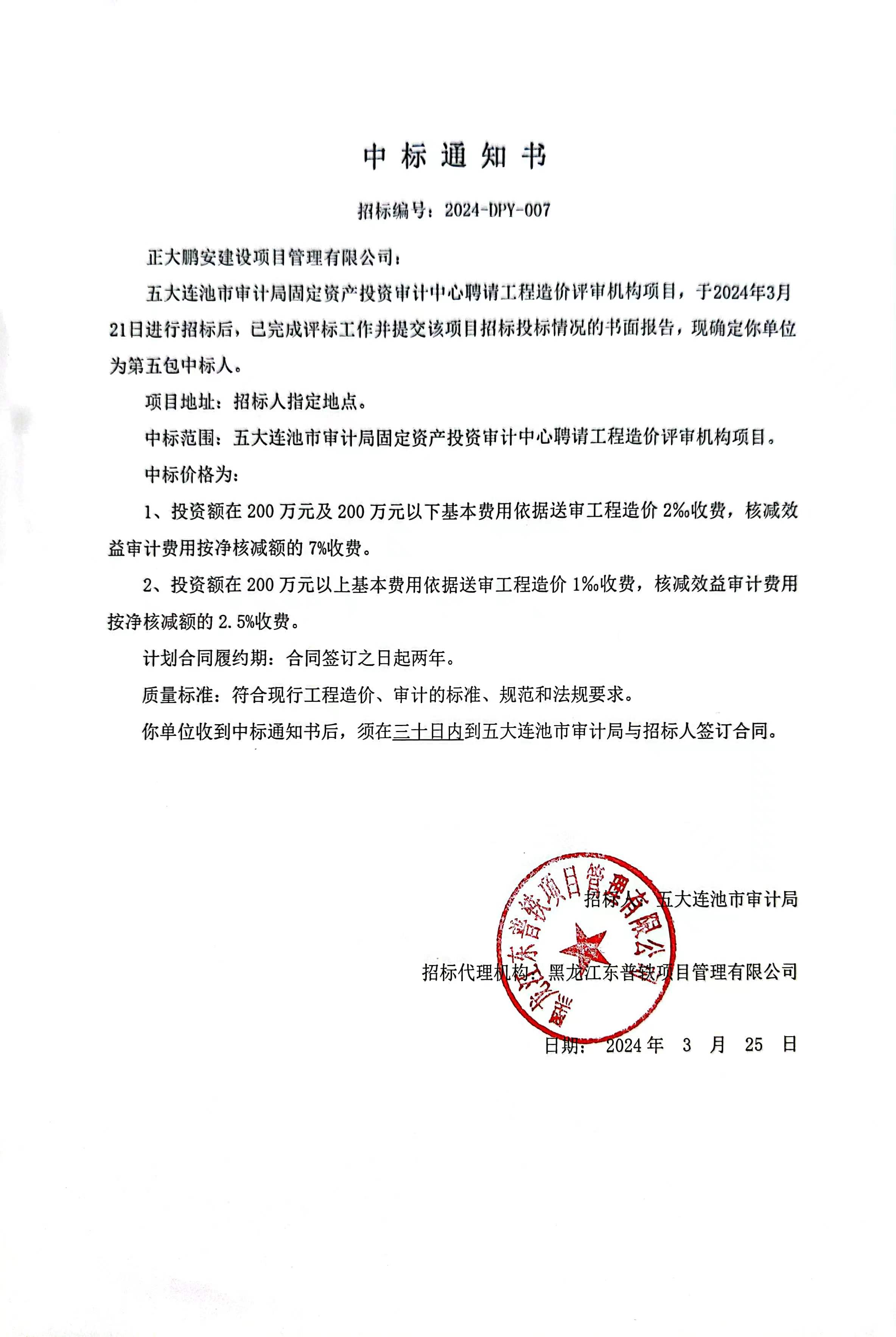 2024年3月,經(jīng)評標(biāo)委員會綜合評審,招標(biāo)人確認(rèn),正大鵬安建設(shè)項(xiàng)目管理有限公司中標(biāo)“五大連池市審計(jì)局固定資產(chǎn)投資審計(jì)中心聘請工程造價評審機(jī)構(gòu)項(xiàng)目”。
