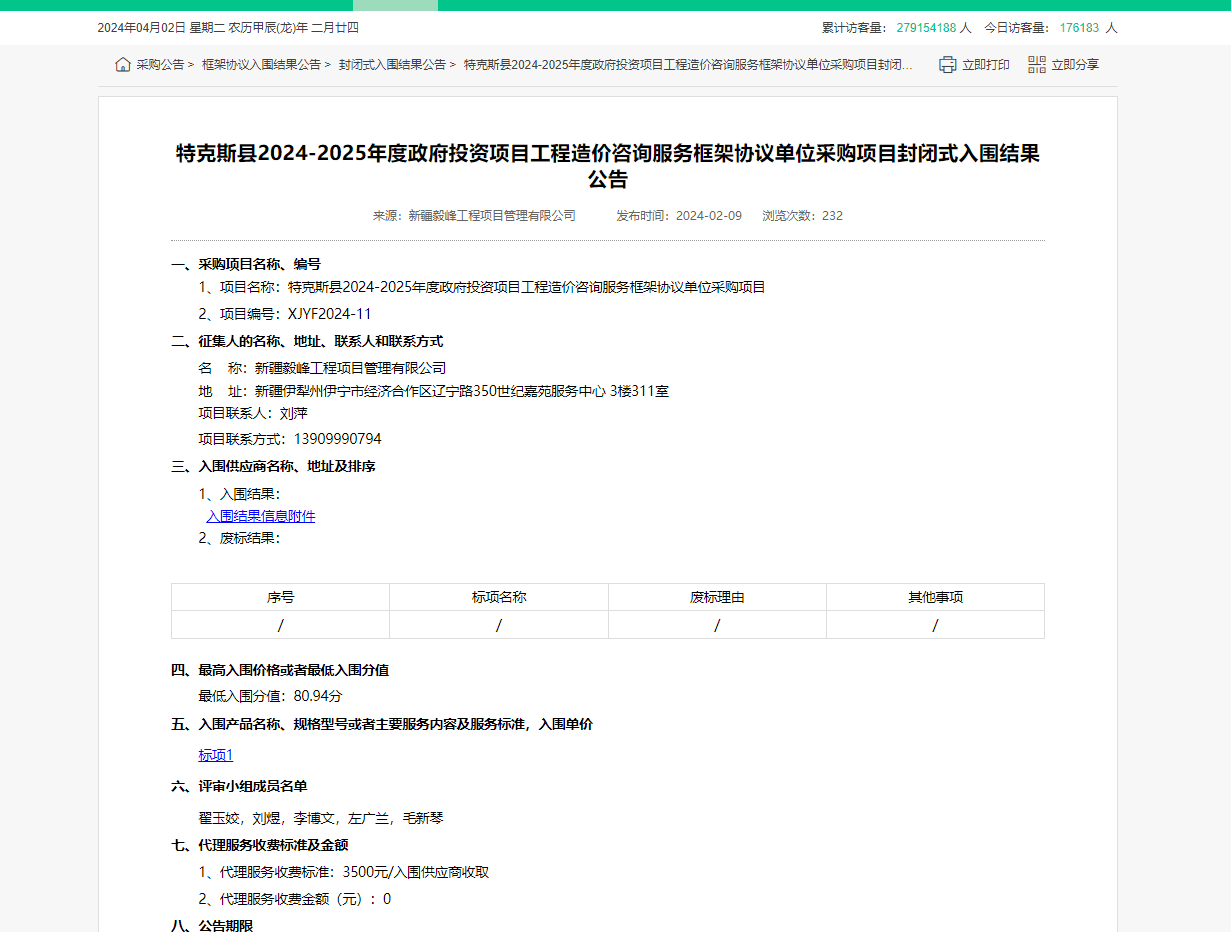 2024年3月,經(jīng)評(píng)標(biāo)委員會(huì)綜合評(píng)審,招標(biāo)人確認(rèn),正大鵬安建設(shè)項(xiàng)目管理有限公司入圍“特克斯縣2024-2025年度政府投資項(xiàng)目工程造價(jià)咨詢(xún)服務(wù)框架協(xié)議單位采購(gòu)項(xiàng)目”。
