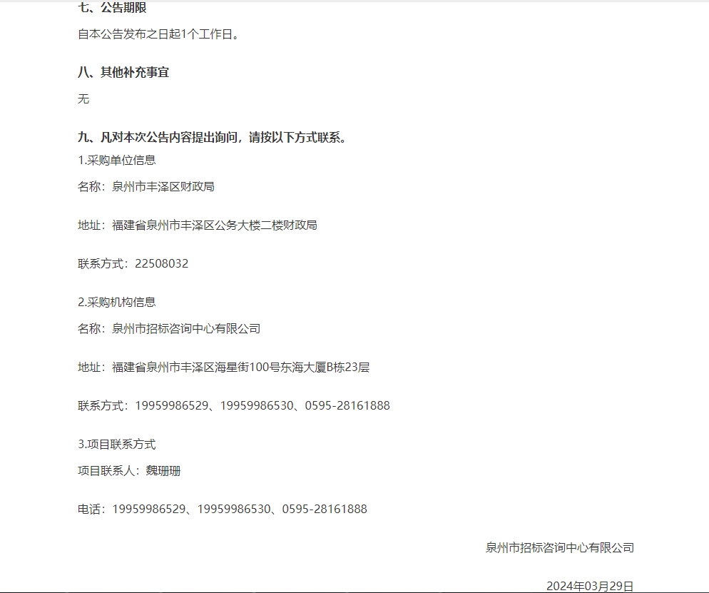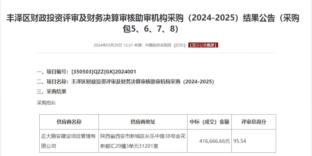 2024年3月29日,經評標委員會綜合評審,招標人確認,正大鵬安建設項目管理有限公司中標“豐澤區(qū)財政投資評審及財務決算審核助審機構采購包6”。
