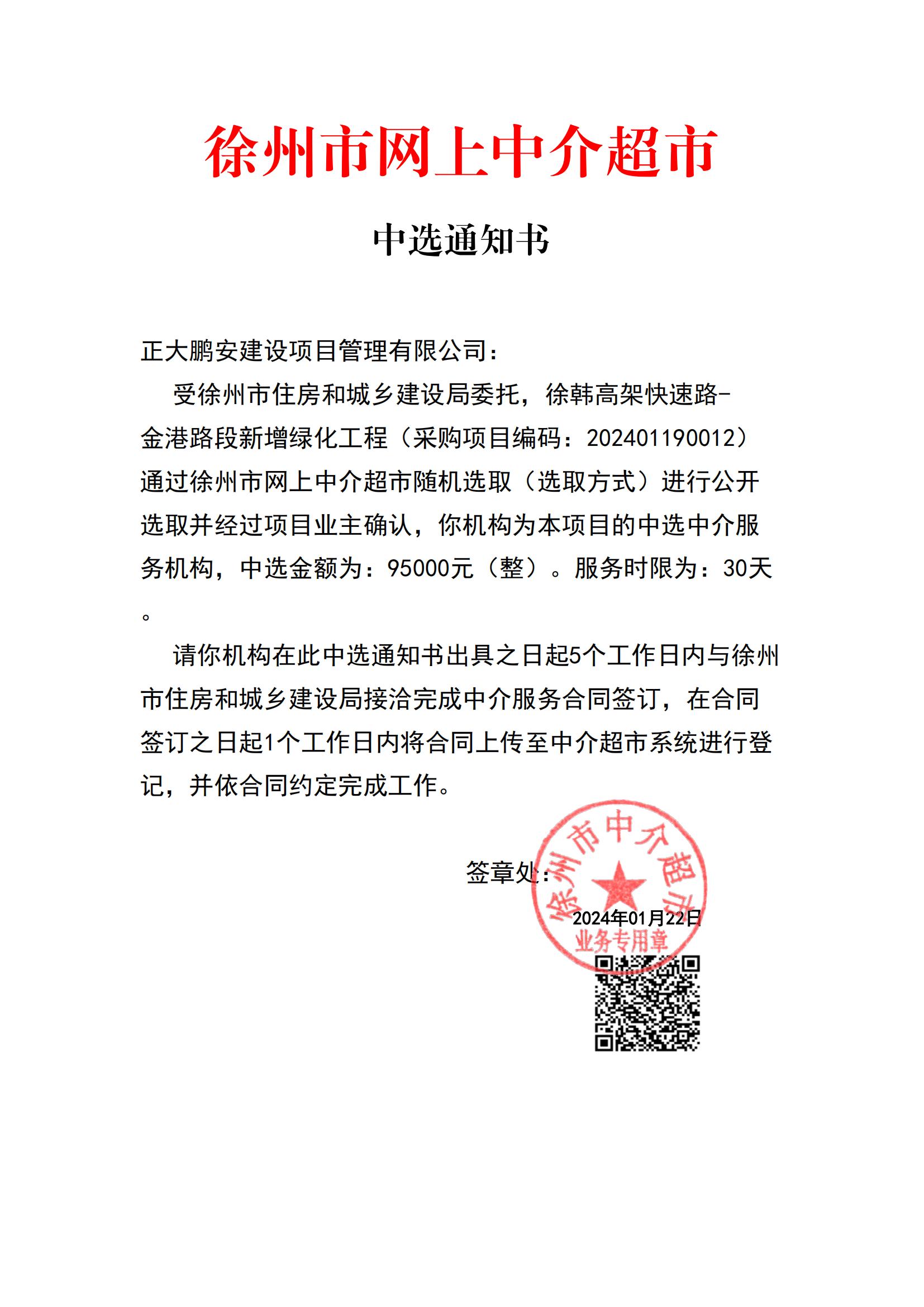 2024年1月22日,經(jīng)評(píng)標(biāo)委員會(huì)綜合評(píng)審,招標(biāo)人確認(rèn),正大鵬安建設(shè)項(xiàng)目管理有限公司中標(biāo)“徐韓高架快速路- 金港路段新增綠化工程”。