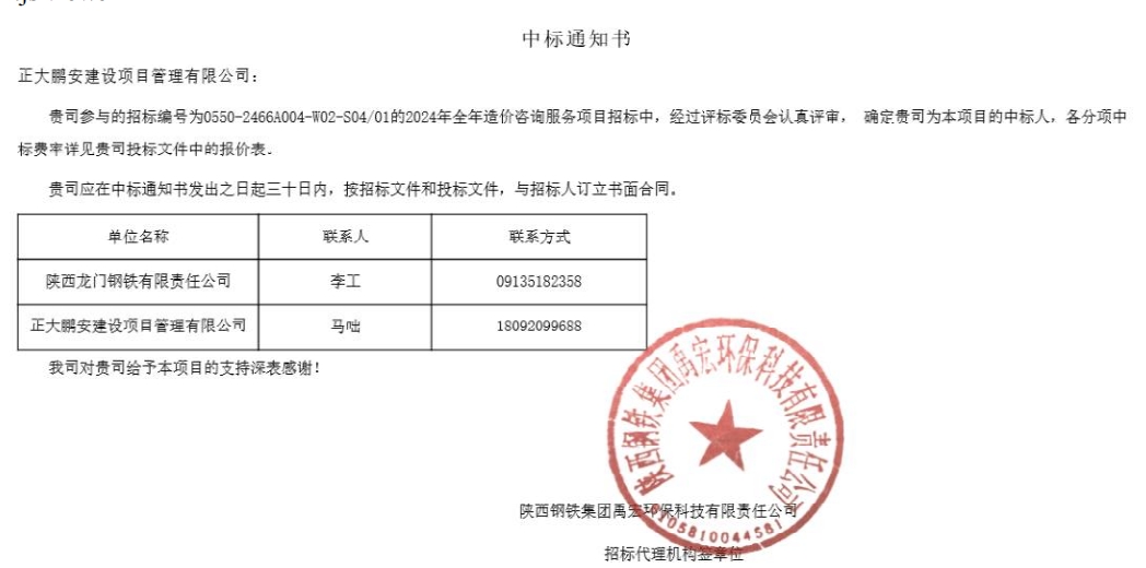 正大鵬安中標陜西龍門鋼鐵2024年全年造價咨詢服務(wù)項目