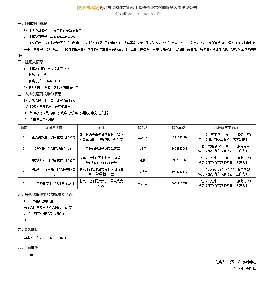 2024年4月10日,經(jīng)評標(biāo)委員會綜合評審,招標(biāo)人確認,正大鵬安建設(shè)項目管理有限公司中標(biāo)“雞西市工程造價評審咨詢服務(wù)項目”。