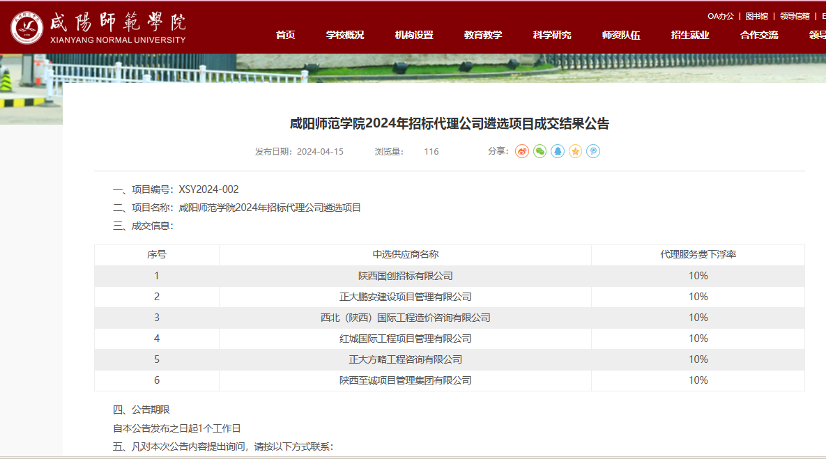 正大鵬安入圍咸陽師范學(xué)院2024年招標(biāo)代理公司遴選項(xiàng)目