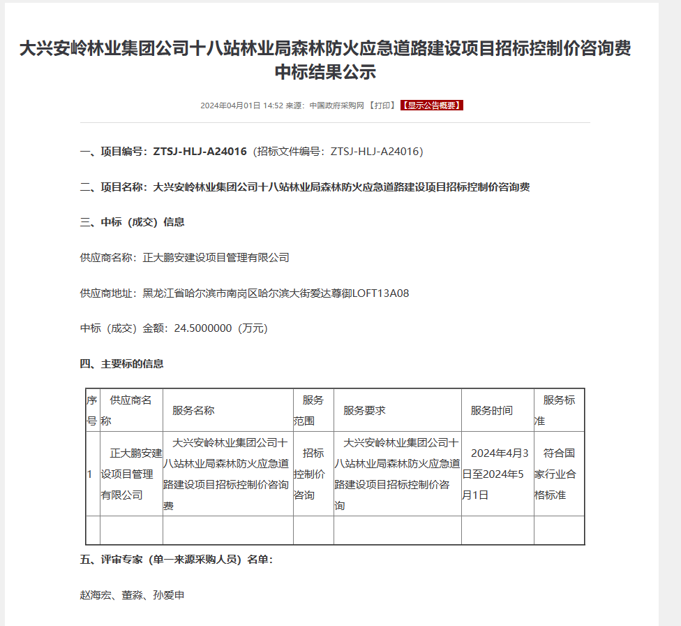 2024年4月1日,經(jīng)評標委員會綜合評審,招標人確認,正大鵬安建設(shè)項目管理有限公司中標“大興安嶺林業(yè)集團公司十八站林業(yè)局森林防火應(yīng)急道路建設(shè)項目”。