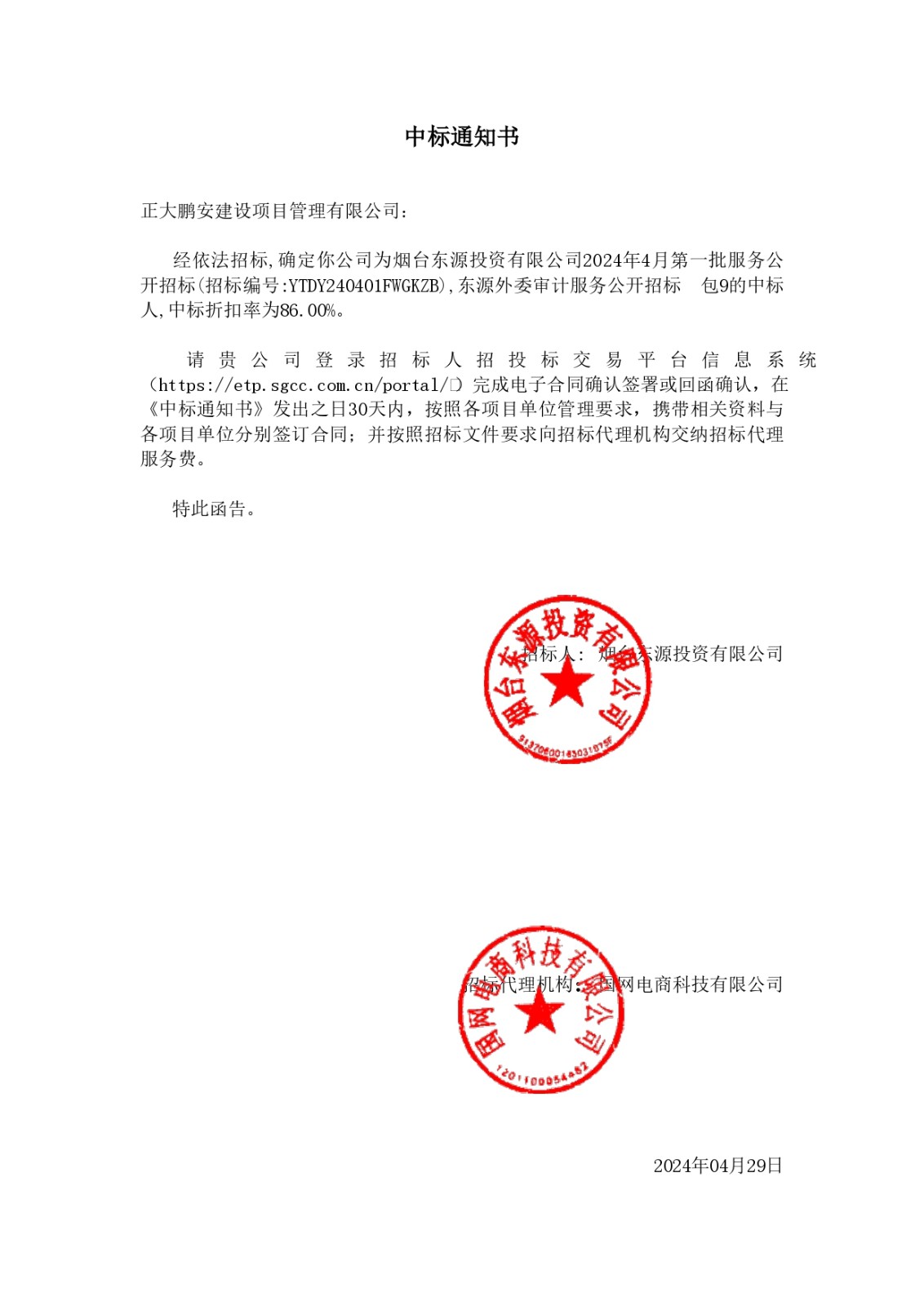2024年4月29日,經評標委員會綜合評審,招標人確認,正大鵬安建設項目管理有限公司中標煙臺東源投資有限公司2024年4月第一批服務公開招標招標編號(YTDY240401FWGKZB),東源外委審計服務公開招標包9