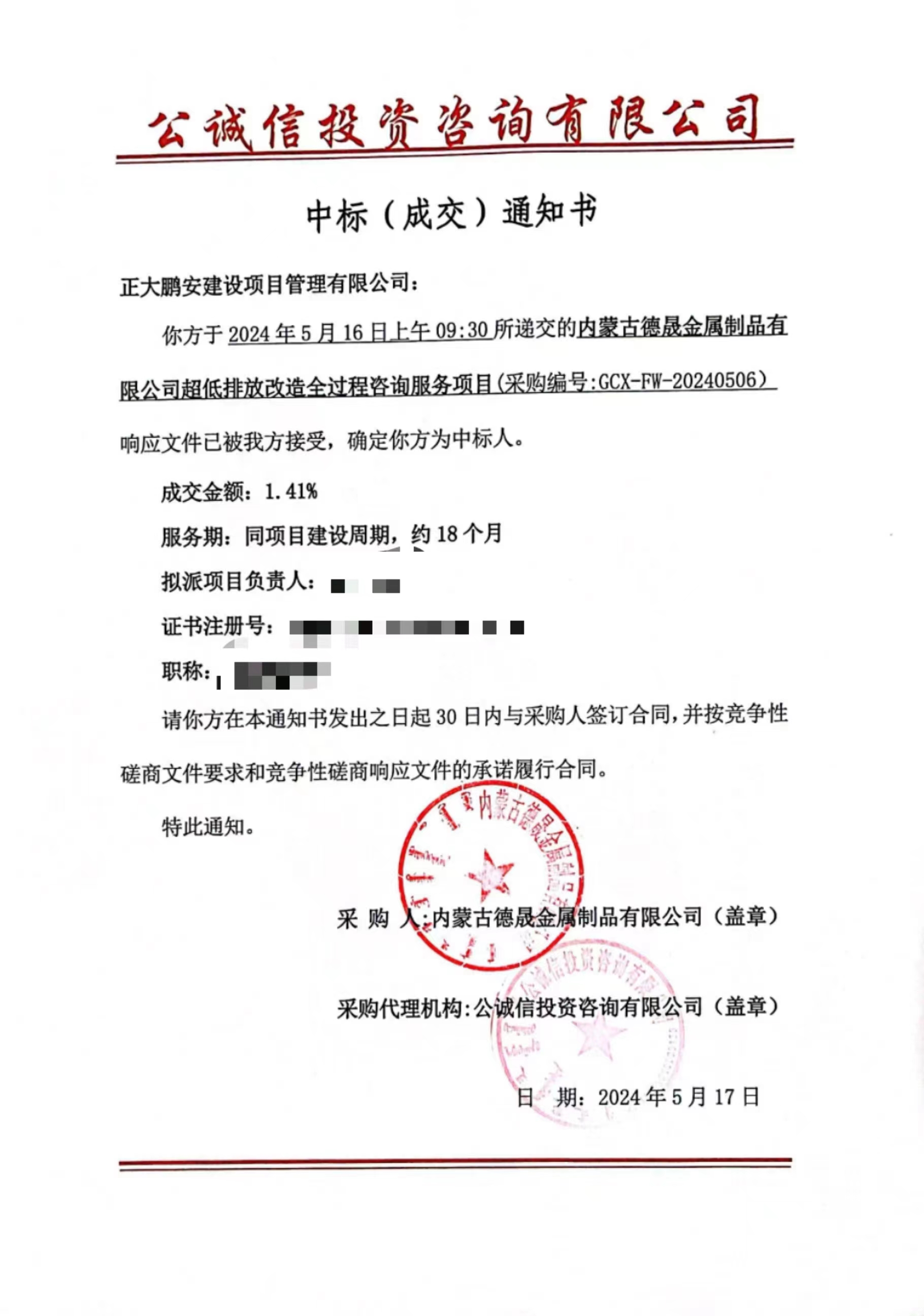 2024年5月16日,經(jīng)評標(biāo)委員會綜合評審,招標(biāo)人確認(rèn),正大鵬安建設(shè)項目管理有限公司中標(biāo)“內(nèi)蒙古德晟金屬制品有限公司超低排放改造全過程咨詢服務(wù)項目”。
