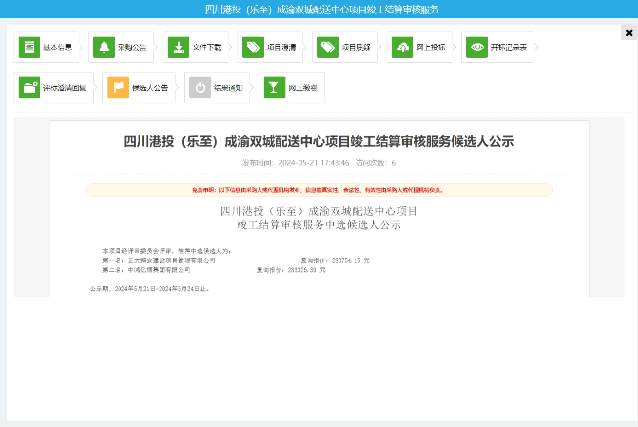 2024年5月21日,經(jīng)評標委員會綜合評審,招標人確認,正大鵬安建設項目管理有限公司中標“四川港投(樂至)成渝雙城配送中心項目竣工結(jié)算審核服務”。