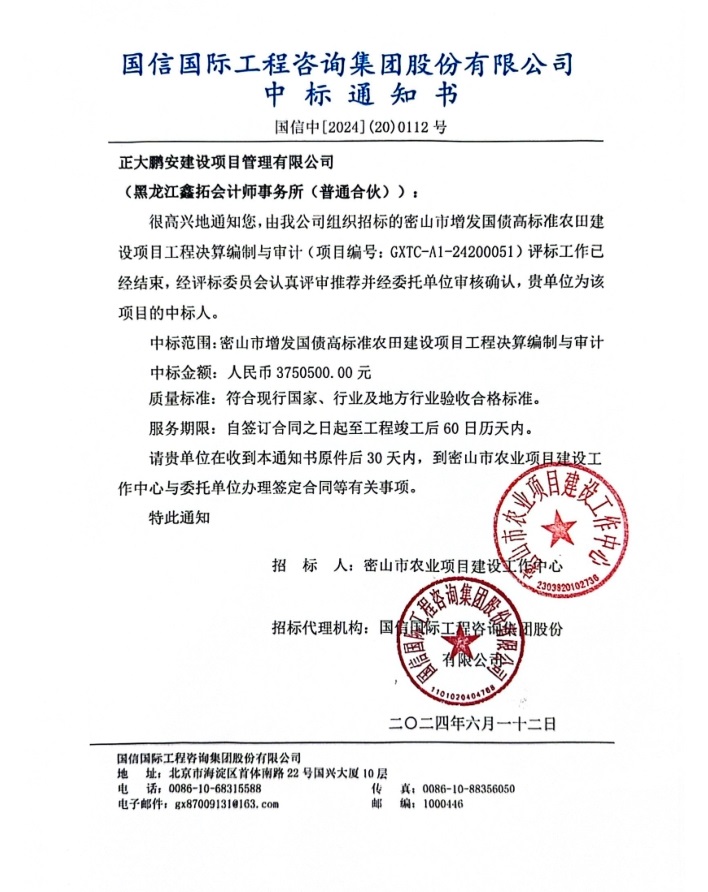 2024年6月12日,經(jīng)評標委員會綜合評審,招標人確認,正大鵬安建設(shè)項目管理有限公司中標“黑龍江密山市增發(fā)國債高標準農(nóng)田建設(shè)項目工程決算編制與審計”。