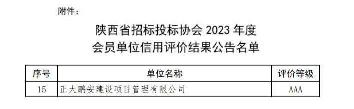 喜報!正大鵬安公司獲評陜西省招標投標協(xié)會2023年度信用評價AAA級企業(yè)