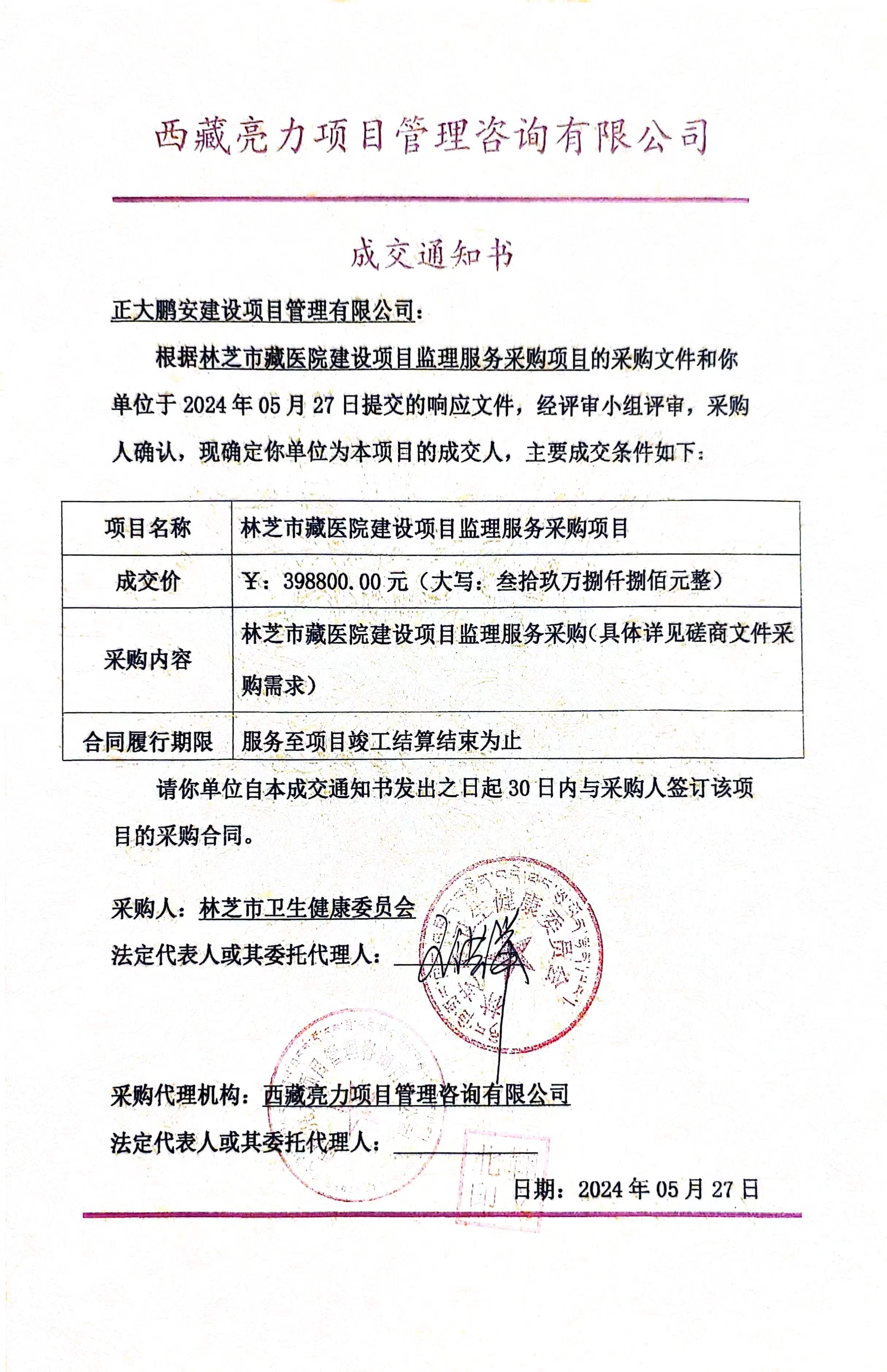 2024年5月27日,經(jīng)評(píng)標(biāo)委員會(huì)評(píng)定,招標(biāo)人確認(rèn),正大鵬安建設(shè)項(xiàng)目管理有限公司中標(biāo)“林芝市藏醫(yī)院建設(shè)項(xiàng)目監(jiān)理服務(wù)采購(gòu)項(xiàng)目”。