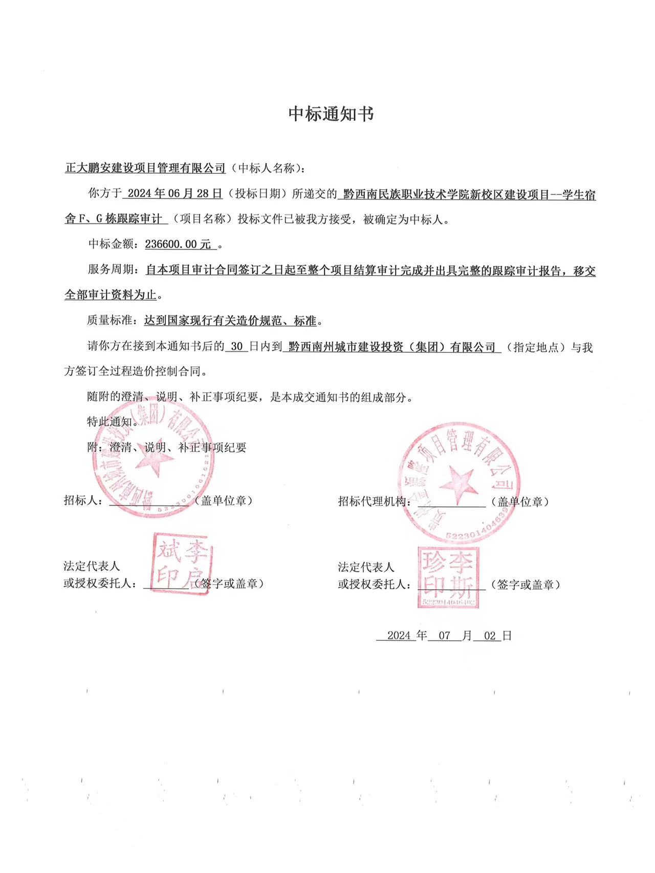 2024年7月2日,經(jīng)評(píng)標(biāo)委員會(huì)綜合評(píng)審,招標(biāo)人確認(rèn),正大鵬安建設(shè)項(xiàng)目管理有限公司中標(biāo)黔西南民族職業(yè)技術(shù)學(xué)院新校區(qū)建設(shè)項(xiàng)目--學(xué)生宿舍F、G棟跟蹤審計(jì).