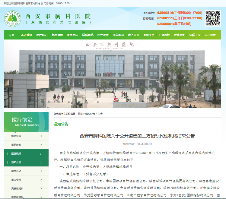 2024年8月1日,經(jīng)評標(biāo)委員會(huì)綜合評審,招標(biāo)人確認(rèn),正大鵬安建設(shè)項(xiàng)目管理有限公司入圍"西安市胸科醫(yī)院第三方招標(biāo)代理機(jī)構(gòu)項(xiàng)目"。