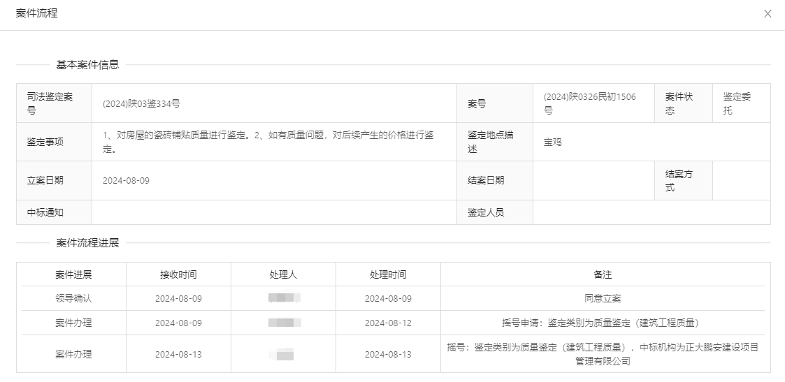 2024年8月9日,經(jīng)寶雞市中級(jí)人民法院確認(rèn),正大鵬安建設(shè)項(xiàng)目管理有限公司中標(biāo)“原告岳海存、王彥生與被告劉西寧裝修施工合同糾紛一案”質(zhì)量司法鑒定項(xiàng)目。