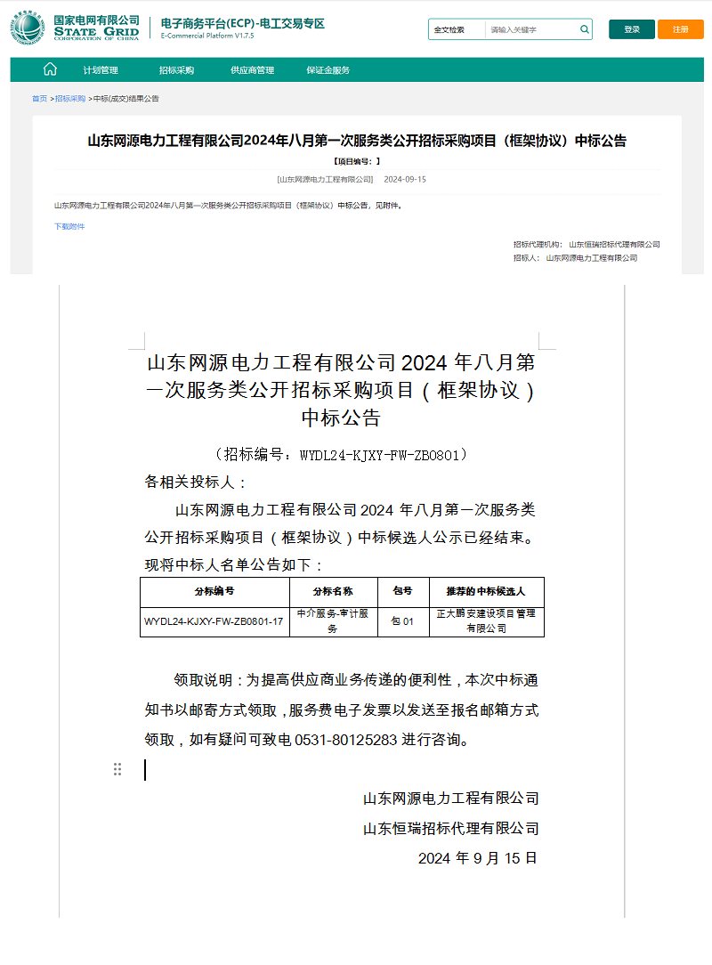 正大鵬安中標(biāo)山東網(wǎng)源電力工程有限公司2024年八月第一次服務(wù)類公開招標(biāo)采購項目(框架協(xié)議)