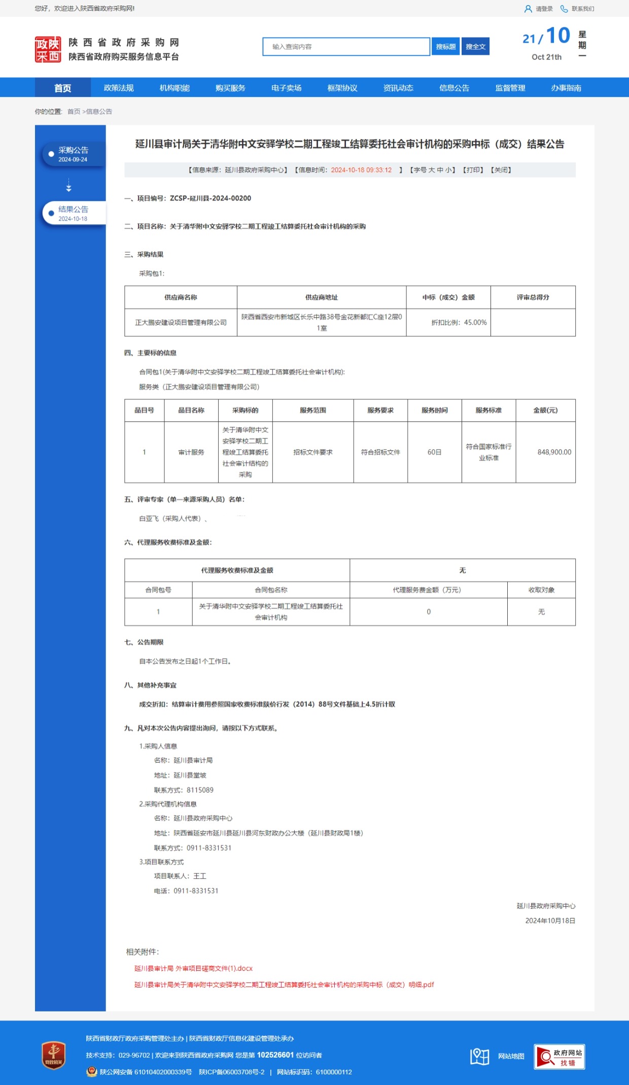 2024年10月10日,經(jīng)評(píng)標(biāo)委員會(huì)綜合評(píng)審,招標(biāo)人確認(rèn),正大鵬安建設(shè)項(xiàng)目管理有限公司中標(biāo)延川縣審計(jì)局關(guān)于清華附中文安驛學(xué)校二期工程竣工結(jié)算委托社會(huì)審計(jì)機(jī)構(gòu)。
