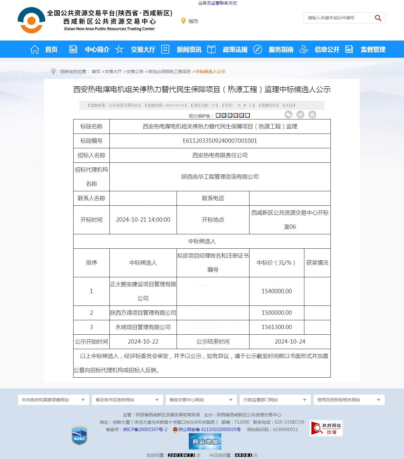 2024年10月25日,經(jīng)評(píng)標(biāo)委員會(huì)綜合評(píng)審,招標(biāo)人確認(rèn),正大鵬安建設(shè)項(xiàng)目管理有限公司中標(biāo)西安熱電煤電機(jī)組關(guān)停熱力替代民生保障項(xiàng)目(熱源工程)監(jiān)理。