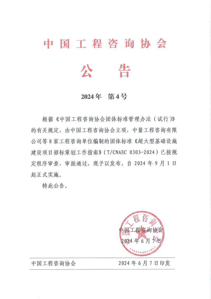 中國工程咨詢協(xié)會公告2024年第4號 發(fā)布《超大型基礎(chǔ)設(shè)施建設(shè)項(xiàng)目招標(biāo)策劃工作指南》(T/CNAEC 0303-2024)