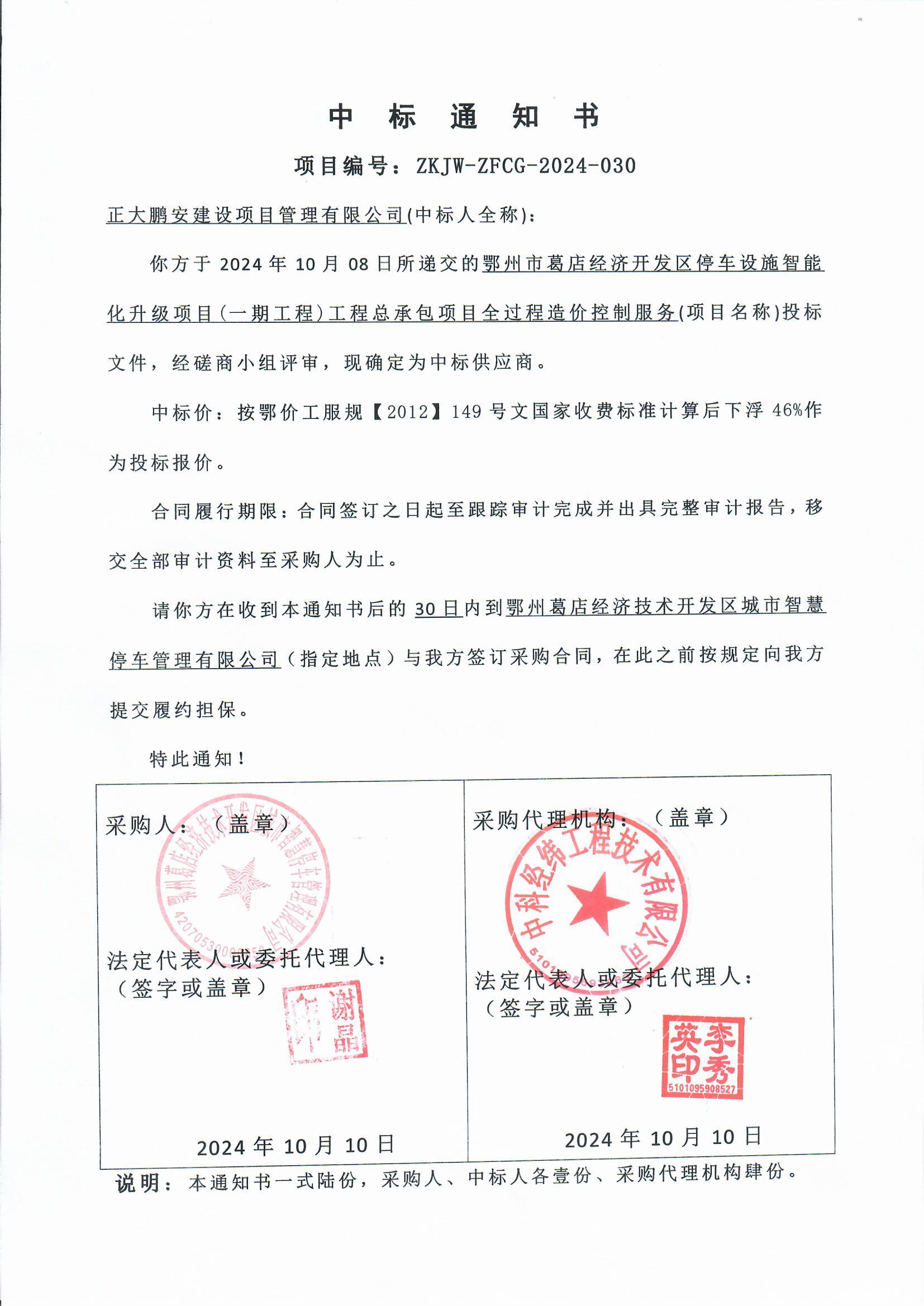 2024年10月10日,經(jīng)評標(biāo)委員會綜合評審,招標(biāo)人確認(rèn),正大鵬安建設(shè)項(xiàng)目管理有限公司中標(biāo)鄂州市葛店經(jīng)濟(jì)開發(fā)區(qū)停車設(shè)施智能化升級項(xiàng)目(一期工程)工程總承包項(xiàng)目全過程造價控制服務(wù)。