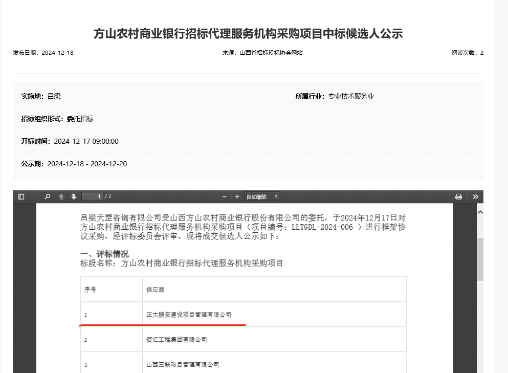 2024年12月17日,經(jīng)評(píng)標(biāo)委員會(huì)綜合評(píng)審,招標(biāo)人確認(rèn),正大鵬安建設(shè)項(xiàng)目管理有限公司入圍方山農(nóng)村商業(yè)銀行招標(biāo)代理服務(wù)機(jī)構(gòu)采購(gòu)項(xiàng)目。