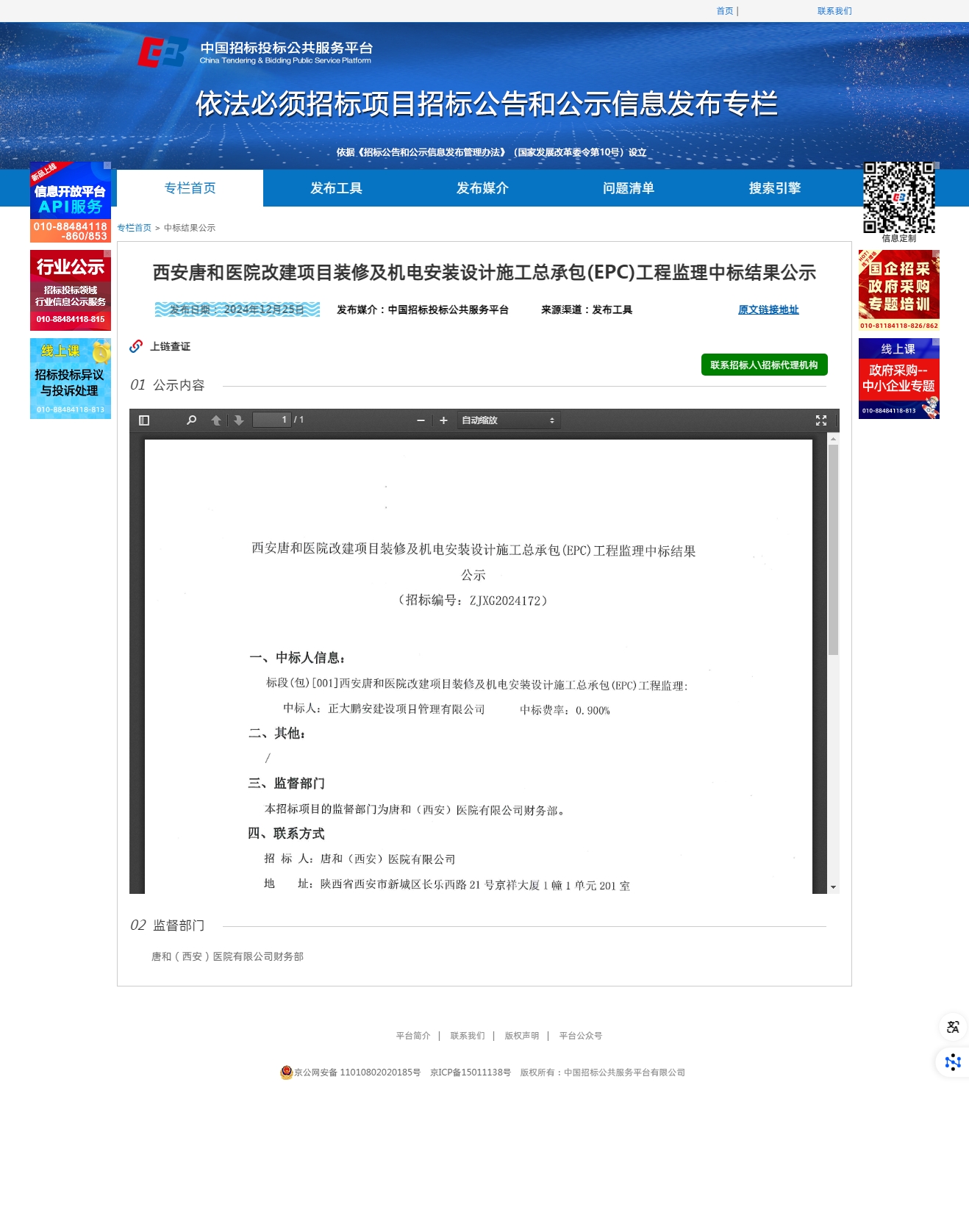 2024年12月25日,經(jīng)評標(biāo)委員會綜合評審,招標(biāo)人確認,正大鵬安建設(shè)項目管理有限公司中標(biāo)西安唐和醫(yī)院改建項目裝修及機電安裝設(shè)計施工總承包(EPC)工程監(jiān)理。