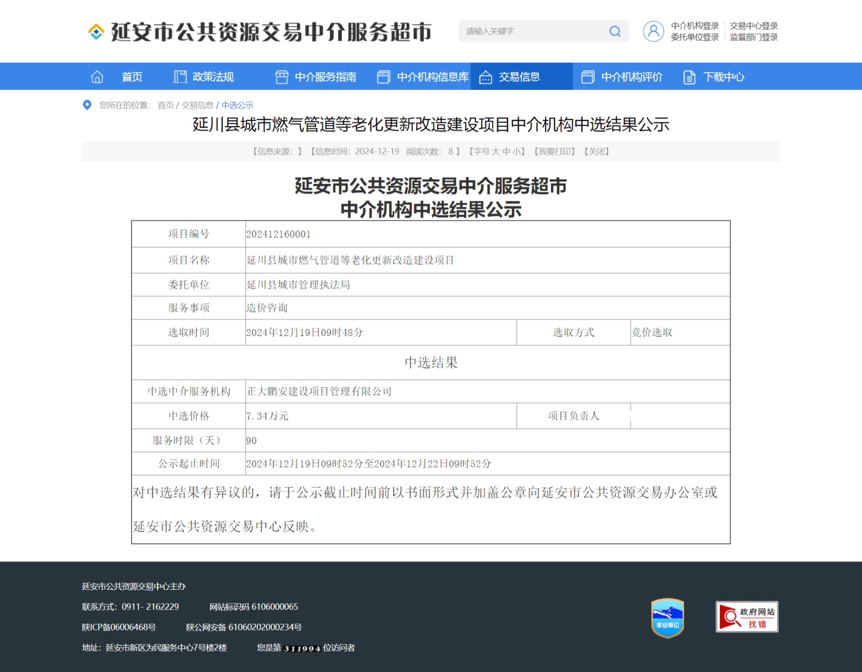 2024年12月19日,正大鵬安建設(shè)項目管理有限公司在延安市公共資源交易中心中介服務(wù)超市機(jī)構(gòu)中選延川縣城市燃?xì)夤艿赖壤匣赂脑旖ㄔO(shè)項目造價咨詢。