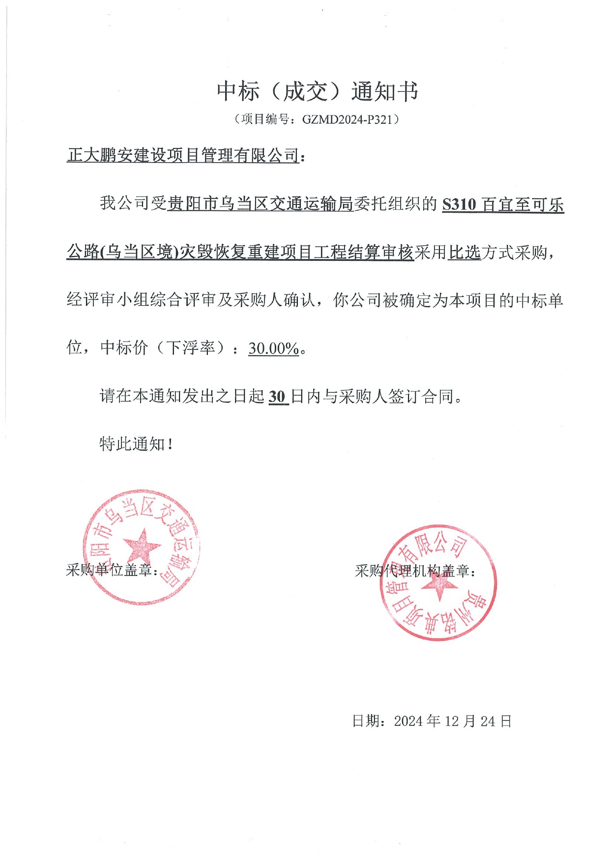 2024年12月24日,經(jīng)評標(biāo)委員會綜合評審,招標(biāo)人確認(rèn),正大鵬安建設(shè)項目管理有限公司中標(biāo)貴州省S310百宜至可樂公路(烏當(dāng)區(qū)境)災(zāi)毀恢復(fù)重建項目工程結(jié)算審核。