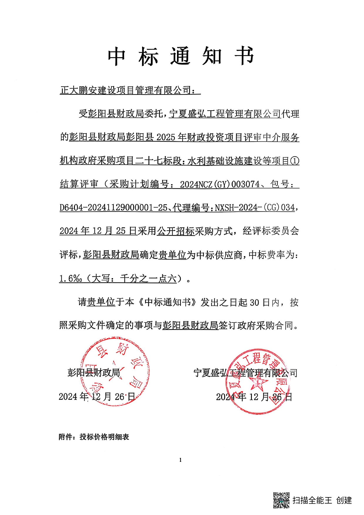 2024年12月26日,經(jīng)評(píng)標(biāo)委員會(huì)綜合評(píng)審,招標(biāo)人確認(rèn),正大鵬安公司中標(biāo)寧夏彭陽(yáng)縣2025年財(cái)政投資項(xiàng)目評(píng)審中介服務(wù)機(jī)構(gòu)政府采購(gòu)項(xiàng)目。