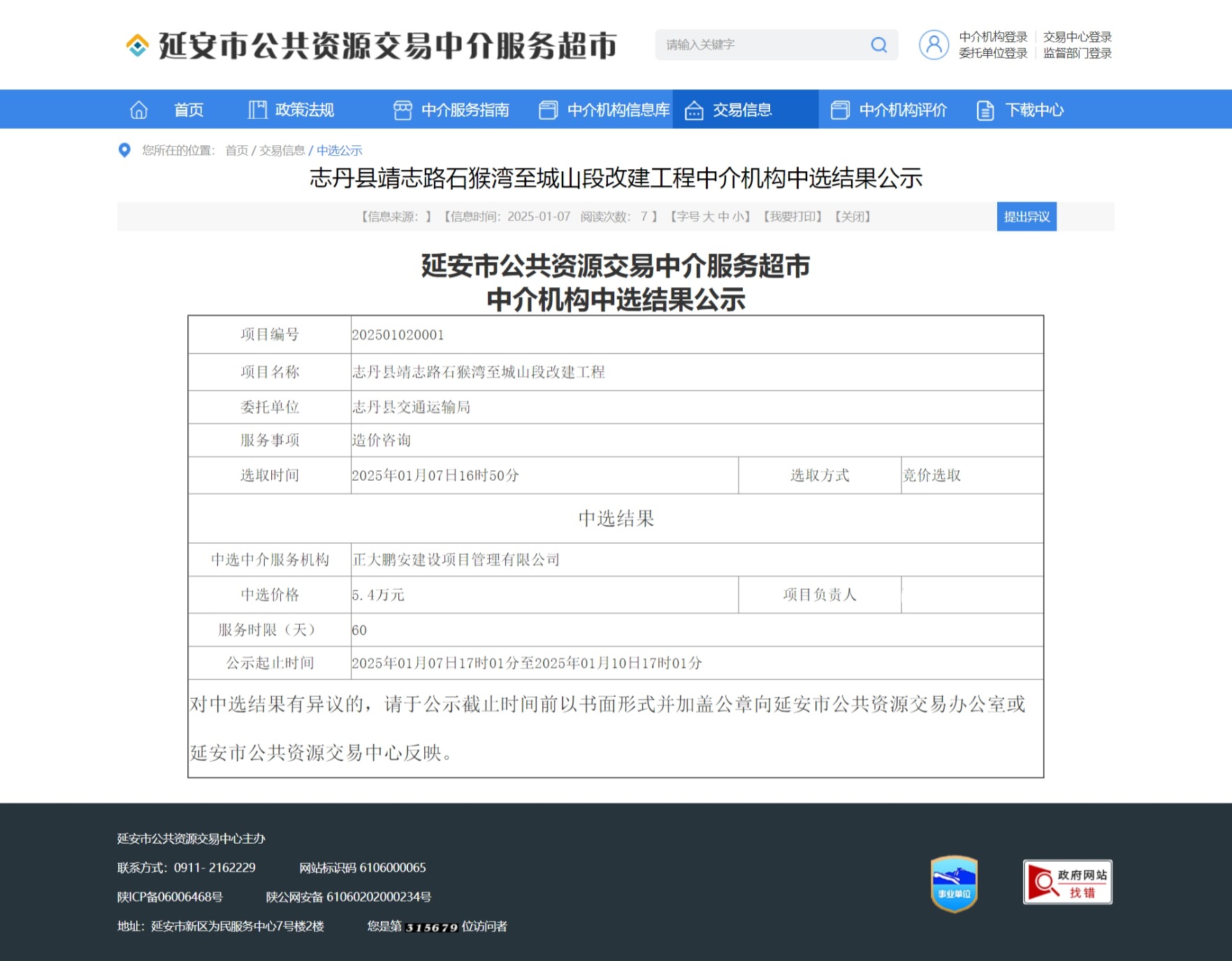 2025年1月7日,正大鵬安建設(shè)項目管理有限公司在延安市公共資源交易中心中介服務(wù)超市機構(gòu)中選志丹縣靖志路石猴灣至城山段改建工程造價咨詢。