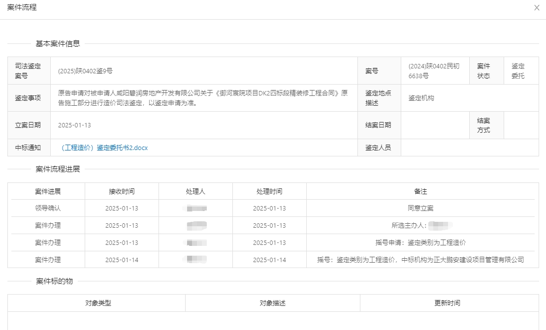 2024年12月30日,經(jīng)咸陽市秦都區(qū)人民法院確認(rèn),正大鵬安建設(shè)項(xiàng)目管理有限公司中標(biāo)“原告南通市深裝裝飾工程有限公司與被告咸陽融麗怡和置業(yè)有限公司、陜西融創(chuàng)璽旭置業(yè)有限公司、咸陽碧潤房地產(chǎn)開發(fā)有限公司關(guān)于精裝修工程合同糾紛一案”造價(jià)司法鑒定項(xiàng)目。