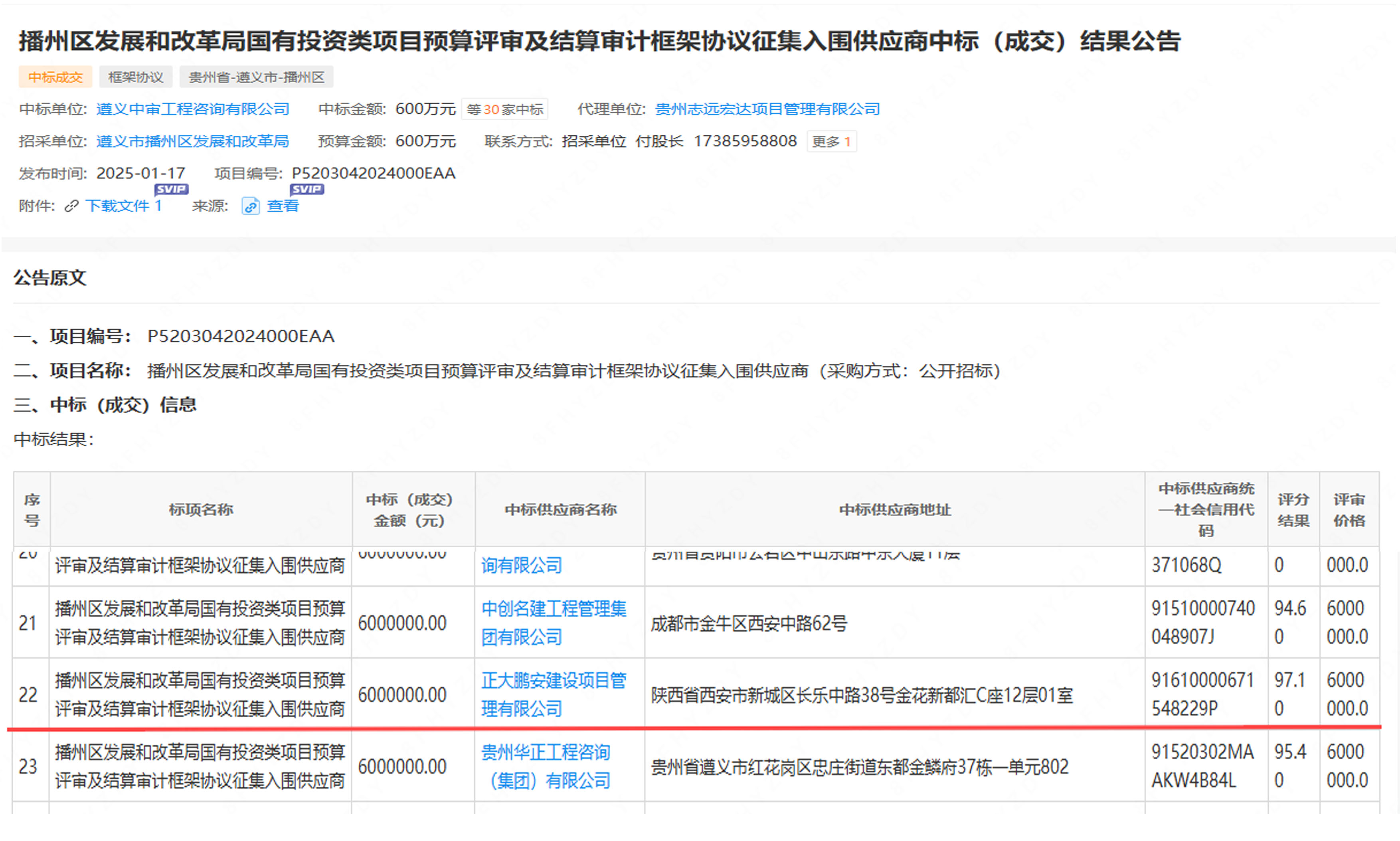 2025年1月17日,經(jīng)評標委員會綜合評審,招標人確認,正大鵬安公司入圍貴州省遵義市播州區(qū)發(fā)展和改革局國有投資類項目預算評審及結(jié)算審計。