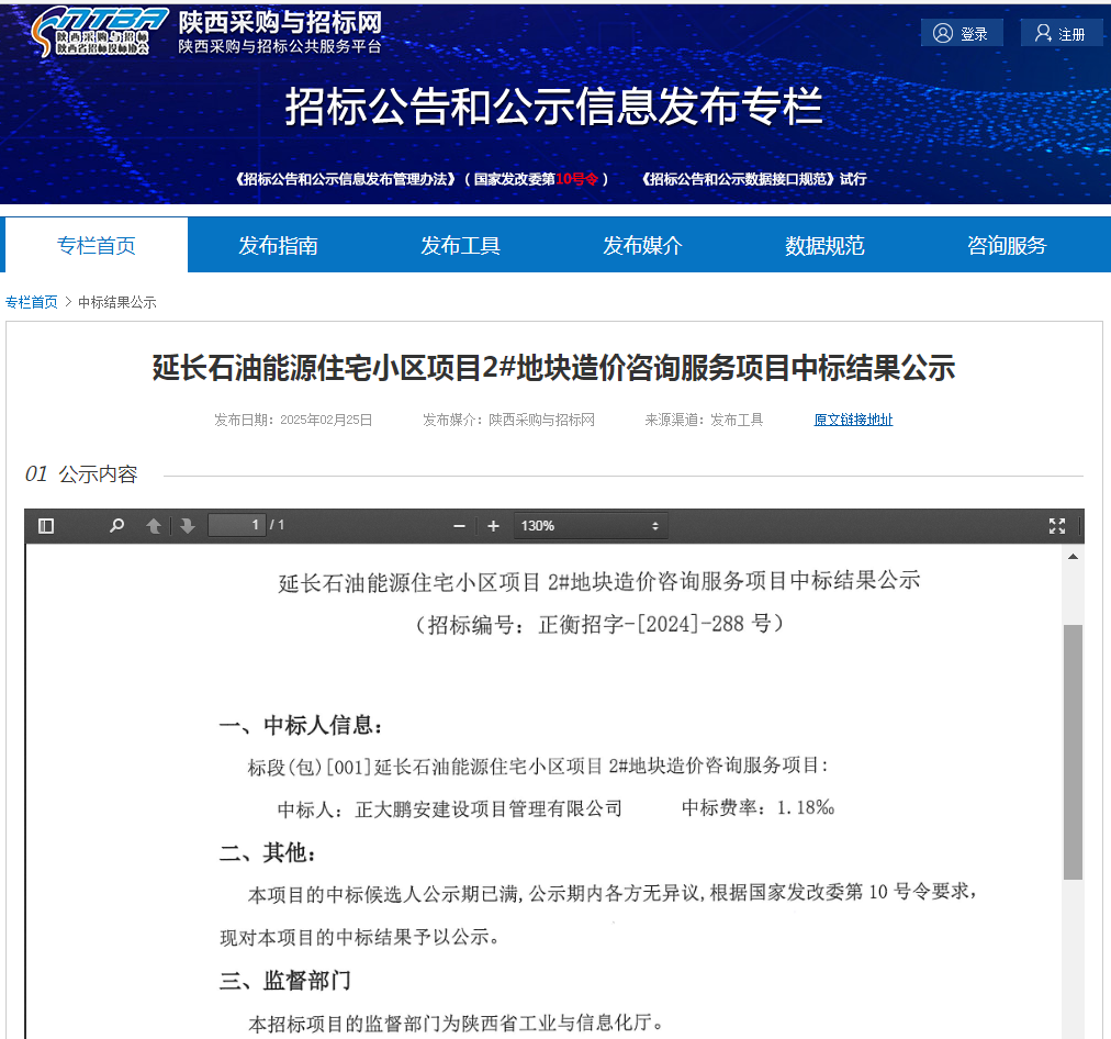 2025年2月19日,經(jīng)評(píng)標(biāo)委員會(huì)綜合評(píng)審,招標(biāo)人確認(rèn),正大鵬安公司中標(biāo)延長(zhǎng)石油能源住宅小區(qū)項(xiàng)目2#地塊造價(jià)咨詢服務(wù)項(xiàng)目。