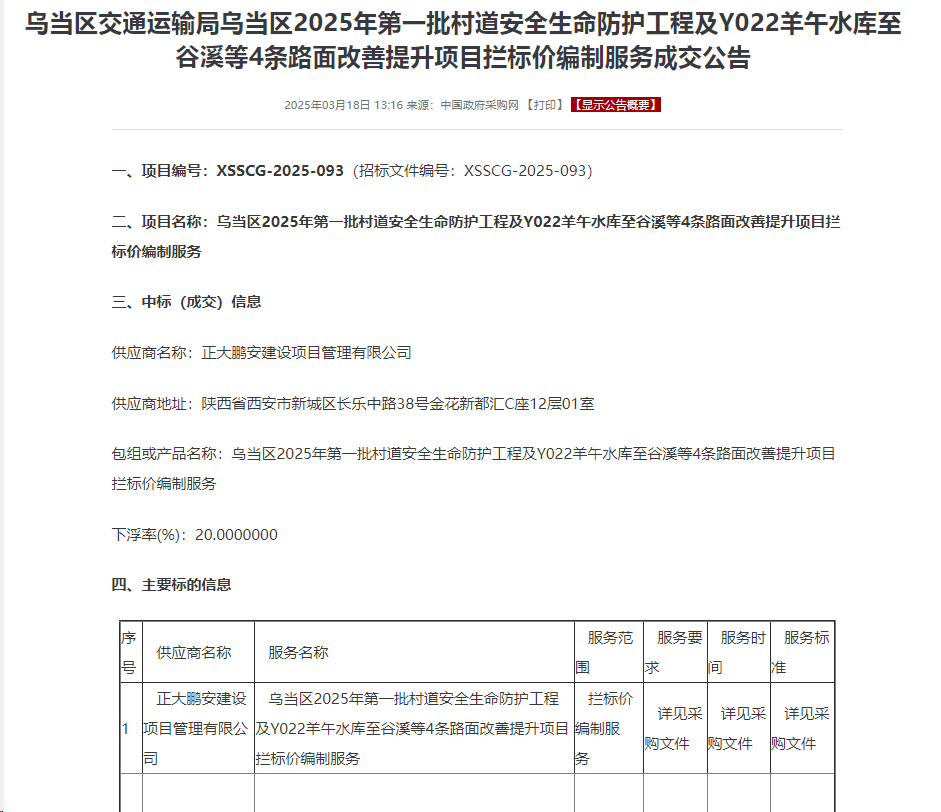 2025年3月18日,經評標委員會綜合評審,招標人確認,正大鵬安中標烏當區(qū)交通運輸局烏當區(qū)2025年第一批村道安全生命防護工程及Y022羊午水庫至谷溪等4條路面改善提升項目攔標價編制服務。