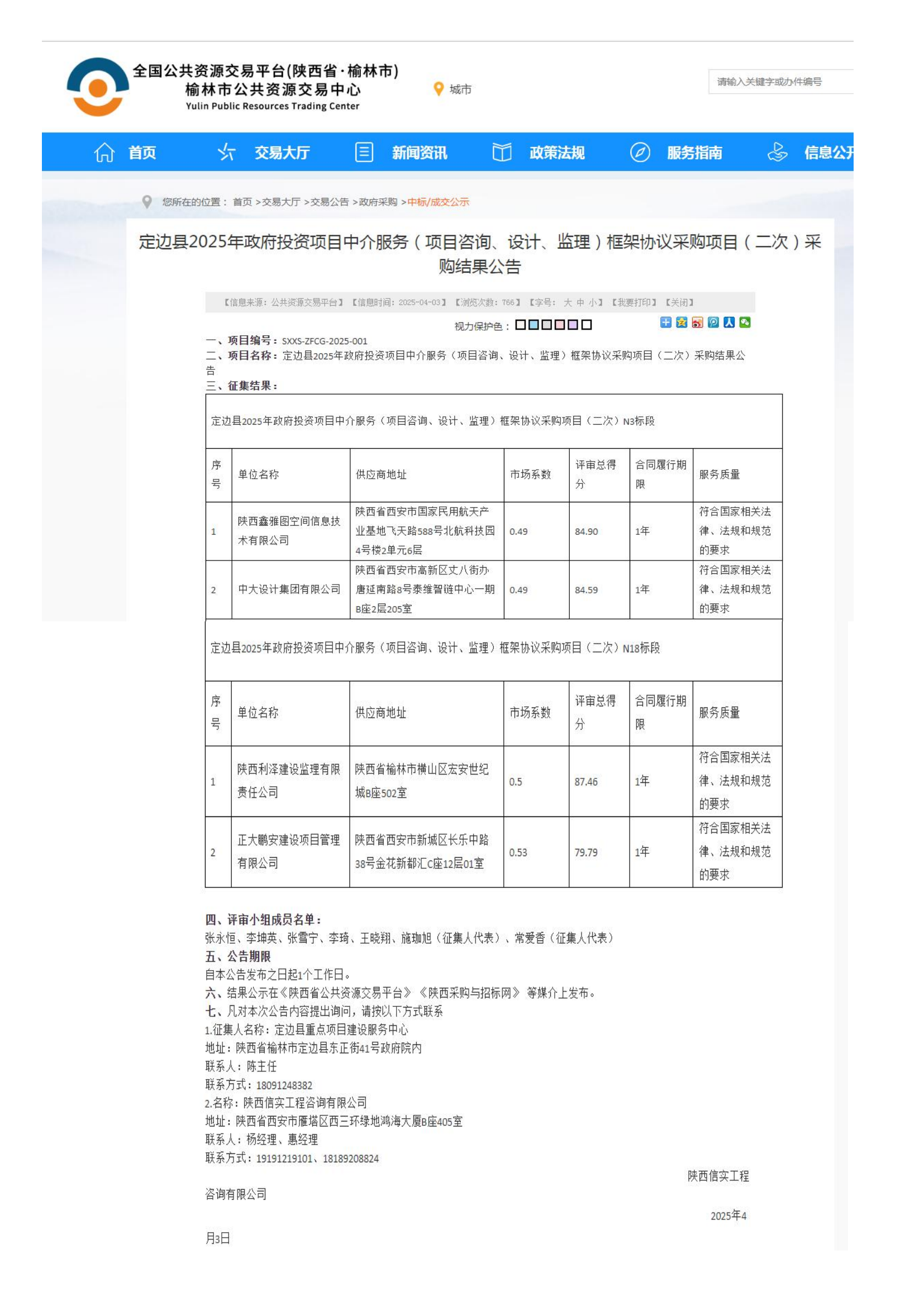 2025年4月3日,經評標委員會綜合評審,招標人確認,正大鵬安中標定邊縣2025年政府投資項目中介服務(項目咨詢、設計、監(jiān)理)框架協(xié)議采購項目(二次)N18標段。
