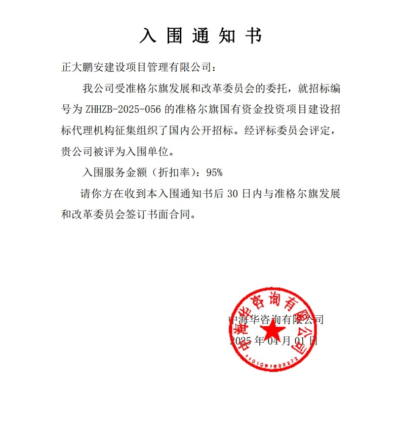 2025年4月1日,經(jīng)評標(biāo)委員會綜合評審,招標(biāo)人確認(rèn),正大鵬安建設(shè)項目管理有限公司入圍準(zhǔn)格爾旗國有資金投資項目建設(shè)招標(biāo)代理機構(gòu)征集項目。