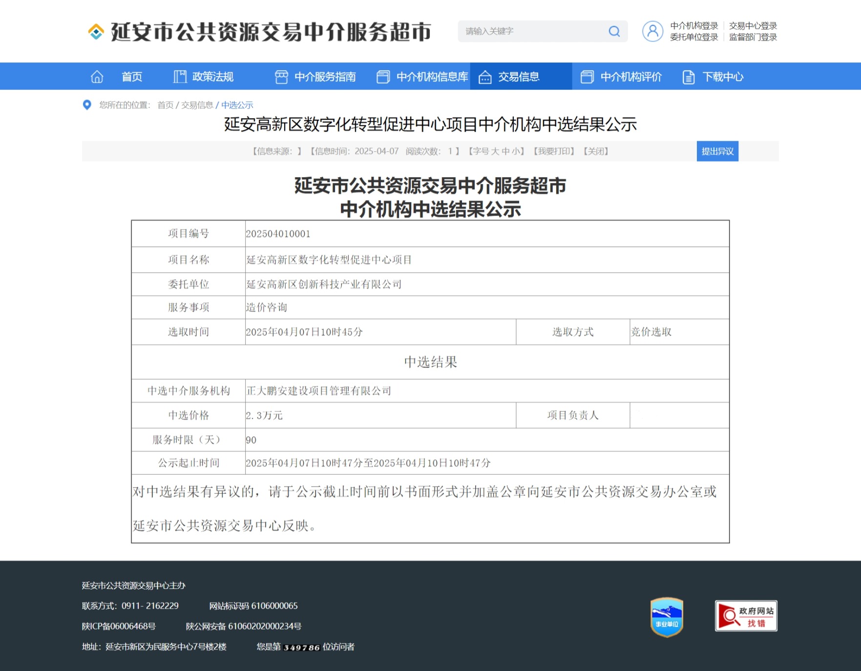 2025年4月7日,正大鵬安建設(shè)項目管理有限公司在延安市公共資源交易中心中介服務(wù)超市機構(gòu)中選延安高新區(qū)數(shù)字化轉(zhuǎn)型促進中心項目造價咨詢。