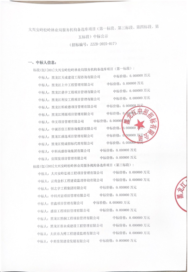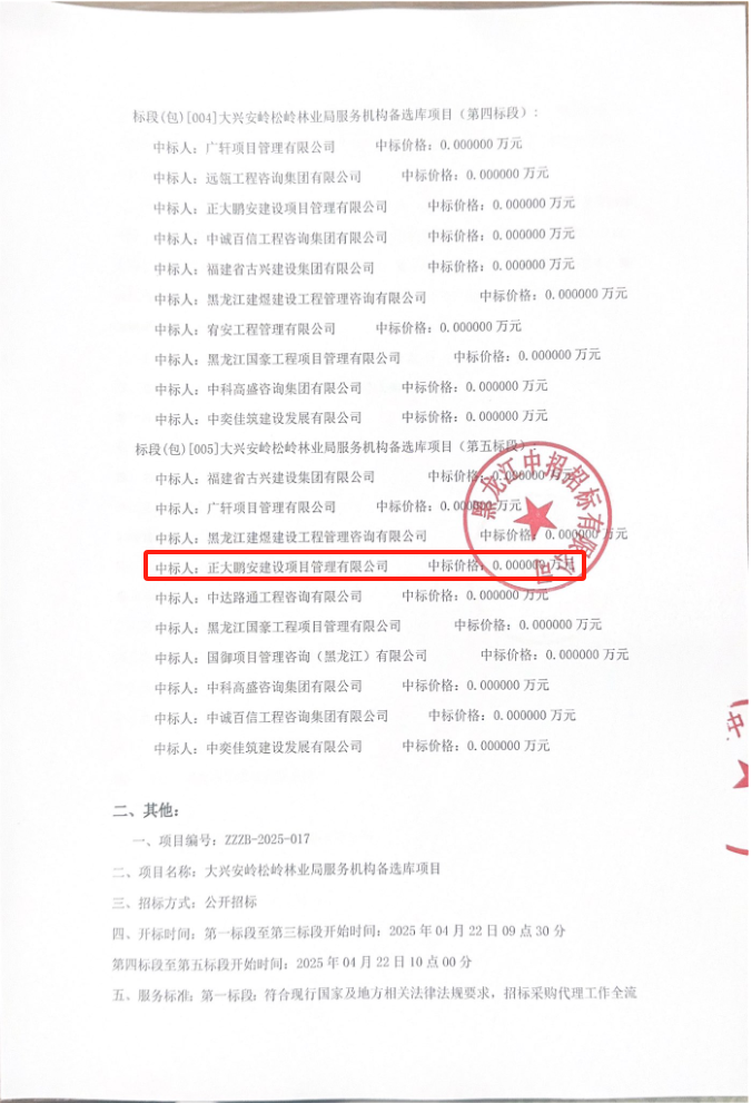 2025年4月23日,經(jīng)評(píng)標(biāo)委員會(huì)綜合評(píng)審,招標(biāo)人確認(rèn),正大鵬安建設(shè)項(xiàng)目管理有限公司中標(biāo)大興安嶺松嶺林業(yè)局服務(wù)機(jī)構(gòu)備選庫(kù)項(xiàng)目(第五標(biāo)段)。