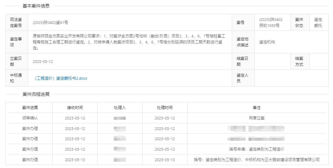 2025年5月12日,經(jīng)咸陽市秦都區(qū)人民法院確認(rèn),正大鵬安建設(shè)項目管理有限公司中標(biāo)“原告陜西金方圓實業(yè)開發(fā)有限公司與被告陜西建工基礎(chǔ)工程集團(tuán)有限公司關(guān)于施工合同糾紛一案”造價司法鑒定項目。