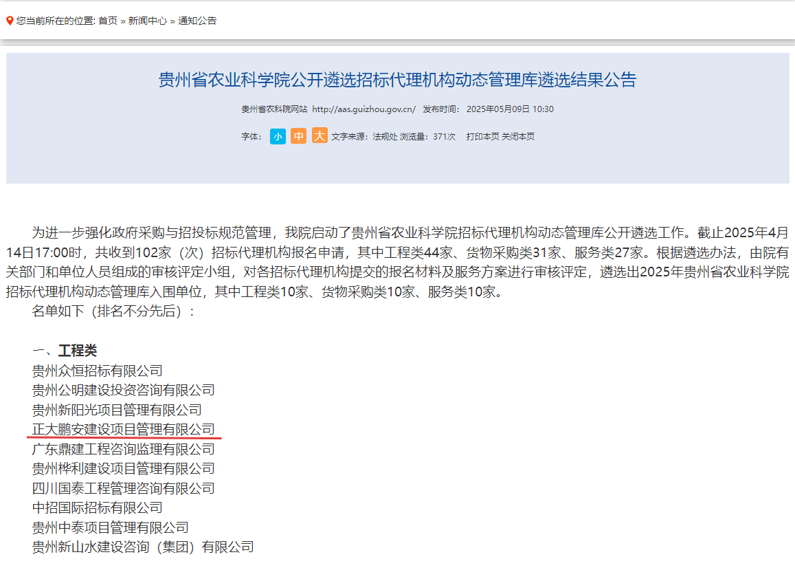 2025年5月09日,經(jīng)評標(biāo)委員會綜合評審,招標(biāo)人確認(rèn),正大鵬安建設(shè)項目管理有限公司入圍貴州省農(nóng)業(yè)科學(xué)院公開遴選招標(biāo)代理機構(gòu)動態(tài)管理庫遴選項目。