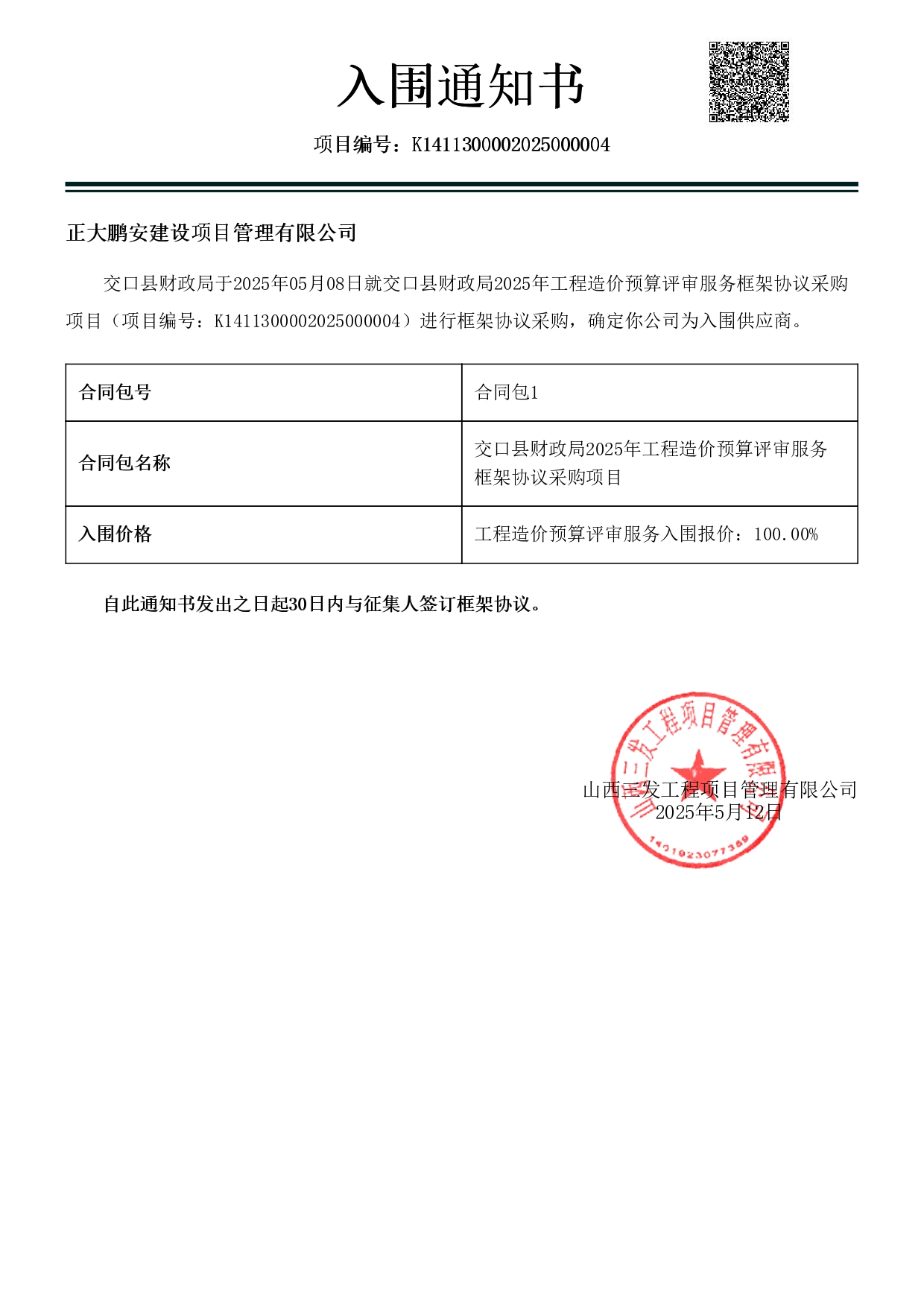 2025年5月12日,經(jīng)評標(biāo)委員會綜合評審,招標(biāo)人確認,正大鵬安建設(shè)項目管理有限公司入圍山西省交口縣財政局2025年工程造價預(yù)算評審服務(wù)框架協(xié)議采購項目。