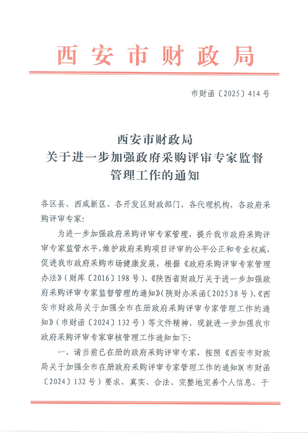 西安市財(cái)政局關(guān)于進(jìn)一步加強(qiáng)政府采購評(píng)審專家監(jiān)督管理工作的通知