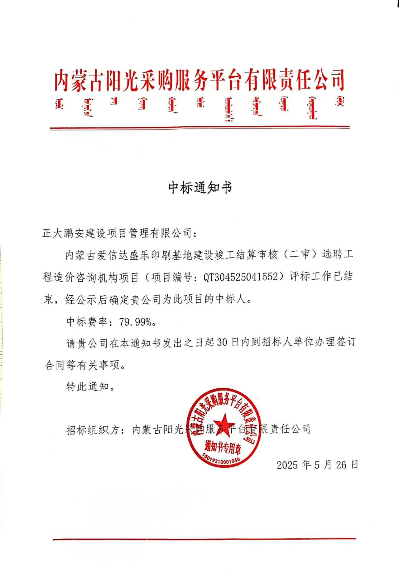 2025年5月26日,經(jīng)評(píng)標(biāo)委員會(huì)綜合評(píng)審,招標(biāo)人確認(rèn),正大鵬安建設(shè)項(xiàng)目管理有限公司中標(biāo)內(nèi)蒙古愛信達(dá)盛樂印刷基地建設(shè)竣工結(jié)算審核(二審)選聘工程造價(jià)咨詢機(jī)構(gòu)項(xiàng)目。