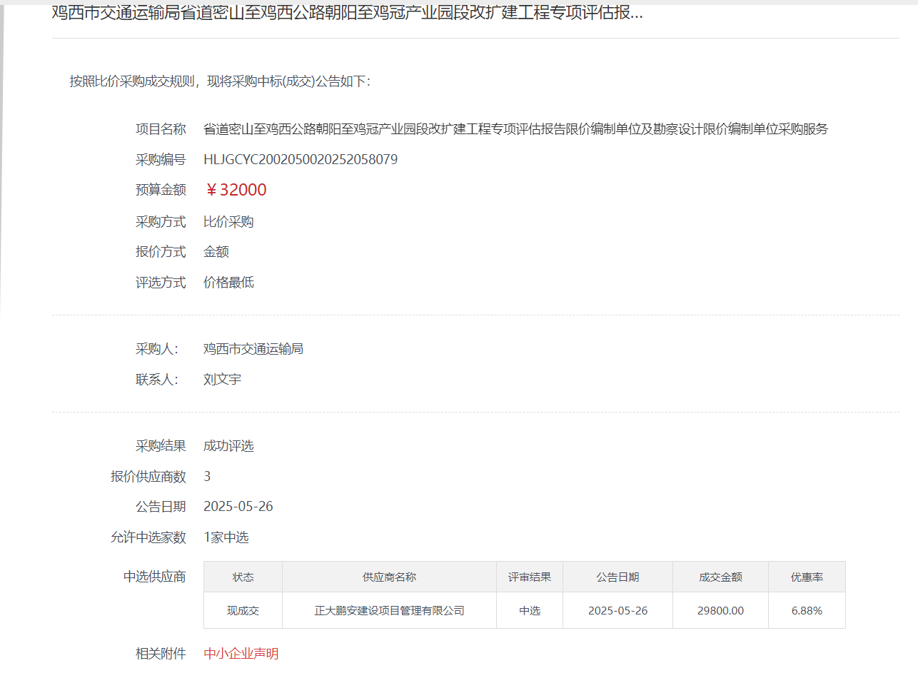 正大鵬安中標(biāo)黑龍江省省道密山至雞西公路朝陽(yáng)至雞冠產(chǎn)業(yè)園段改擴(kuò)建工程專項(xiàng)評(píng)估報(bào)告限價(jià)編制單位及勘察設(shè)計(jì)限價(jià)編制單位采購(gòu)服務(wù)